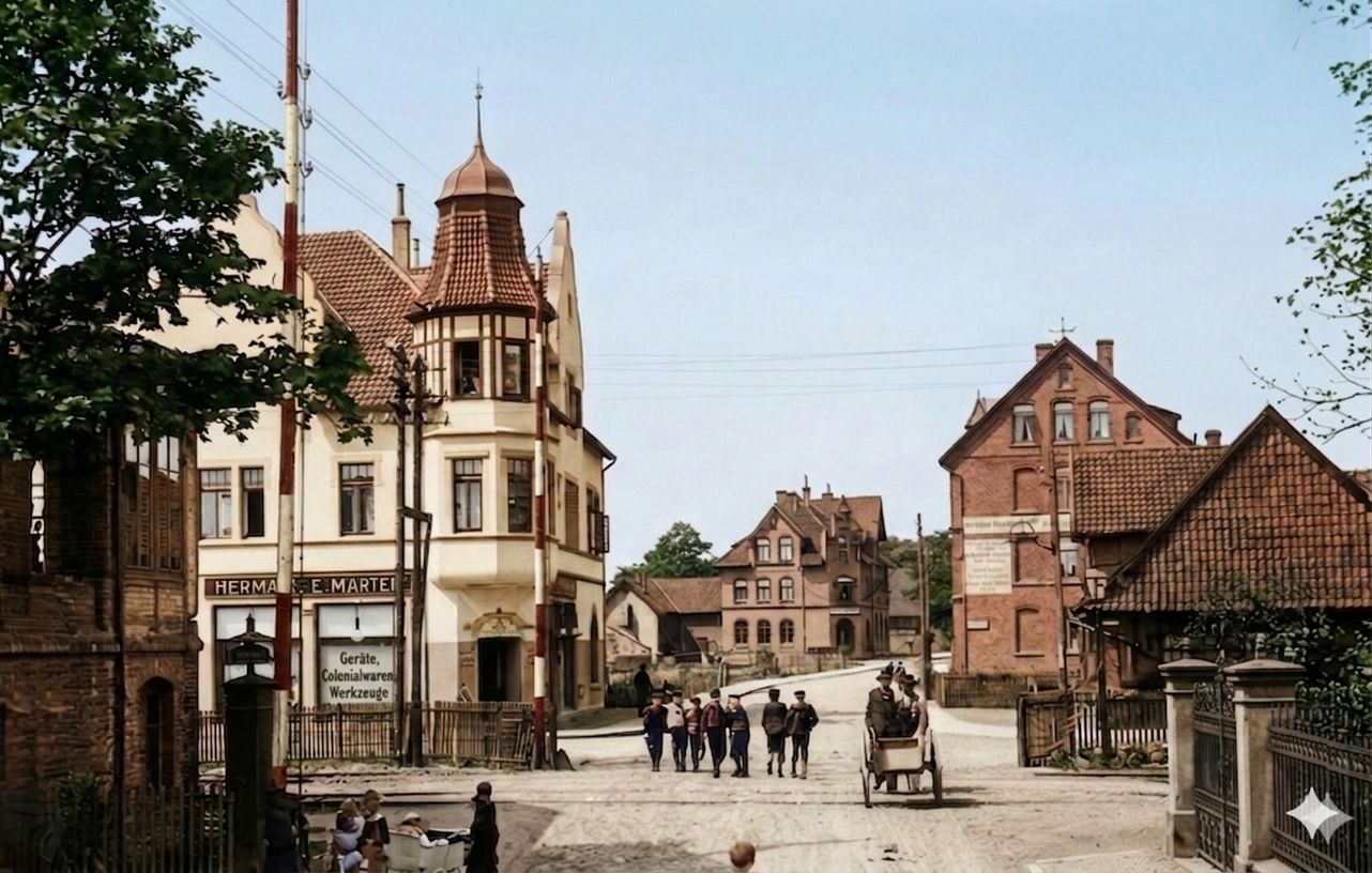 Die Schranke an der Ahltener Straße. 1905 baut Hermann Ludwig Marten das Wohn und- Geschäftshaus. Hier wurde Weiß- Kurzwaren und Wäsche angeboten. Das Haus wird 1944 durch Bombentreffer zerstört und nur zum Teil wieder aufgebaut worden.