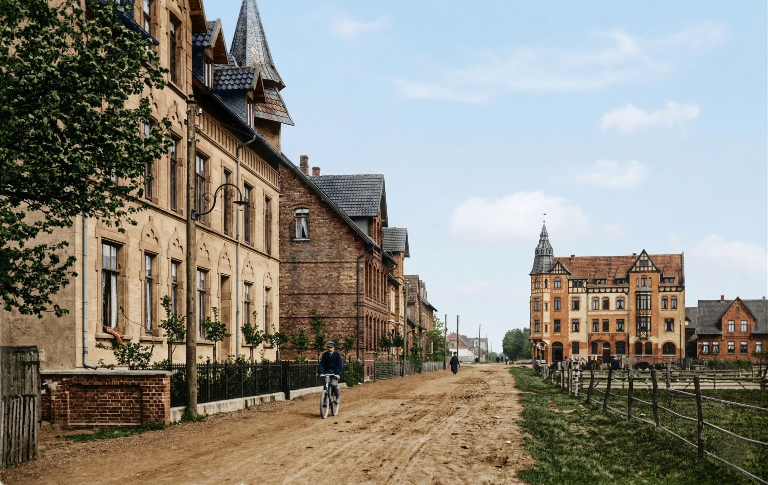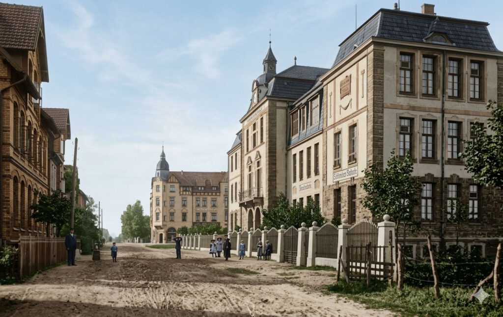 Das linke Bild zeigt die Feldstraße noch vor dem Bau der Schule.